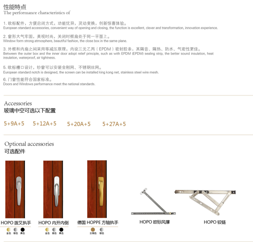 【產品系列】:塞納 【產品性能】:水密性能5級、隔音性能≥35DB、氣密性能6級、抗風壓性能8級、保溫性能K≤2.5 【產品結構】:采用6063-T5鋁材,防水軌隱藏排水結構,四道防撞膠條密封設計,5+20A+5中空玻璃 【五金配件】:標配好博窄邊暗鎖