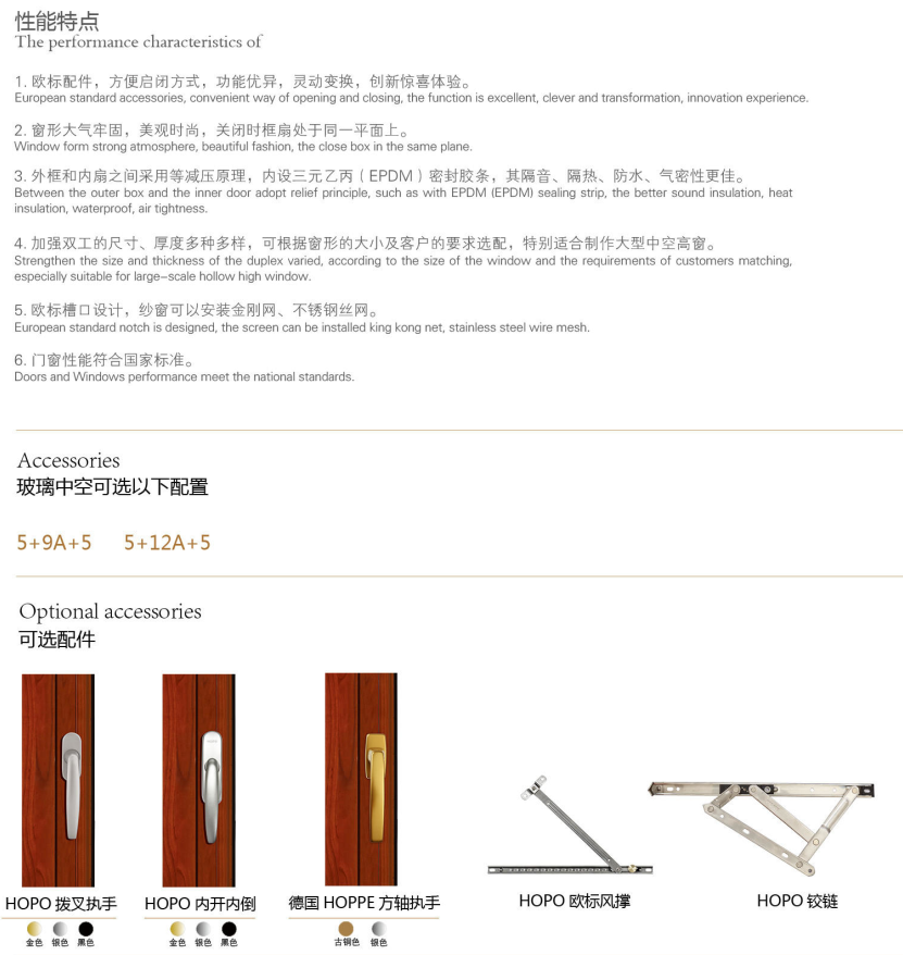 【產(chǎn)品系列】:塞納 【產(chǎn)品性能】:水密性能5級(jí)、隔音性能≥35DB、氣密性能6級(jí)、抗風(fēng)壓性能8級(jí)、保溫性能K≤2.5 【產(chǎn)品結(jié)構(gòu)】:采用6063-T5鋁材,防水軌隱藏排水結(jié)構(gòu),四道防撞膠條密封設(shè)計(jì),5+20A+5中空玻璃 【五金配件】:標(biāo)配好博窄邊暗鎖