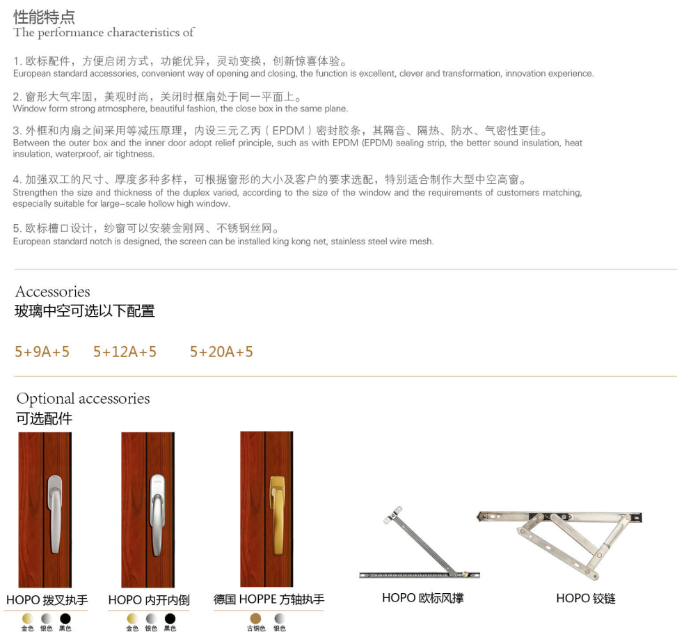 【產品系列】:塞納 【產品性能】:水密性能5級、隔音性能≥35DB、氣密性能6級、抗風壓性能8級、保溫性能K≤2.5 【產品結構】:采用6063-T5鋁材,防水軌隱藏排水結構,四道防撞膠條密封設計,5+20A+5中空玻璃 【五金配件】:標配好博窄邊暗鎖