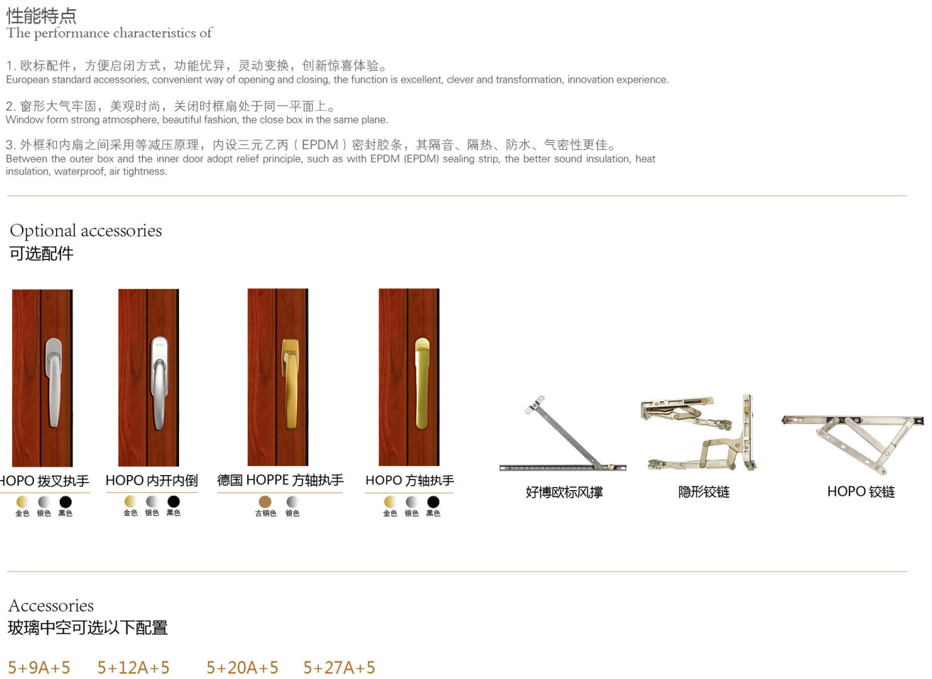 【產(chǎn)品系列】:塞納 【產(chǎn)品性能】:水密性能5級、隔音性能≥35DB、氣密性能6級、抗風(fēng)壓性能8級、保溫性能K≤2.5 【產(chǎn)品結(jié)構(gòu)】:采用6063-T5鋁材,防水軌隱藏排水結(jié)構(gòu),四道防撞膠條密封設(shè)計(jì),5+20A+5中空玻璃 【五金配件】:標(biāo)配好博窄邊暗鎖