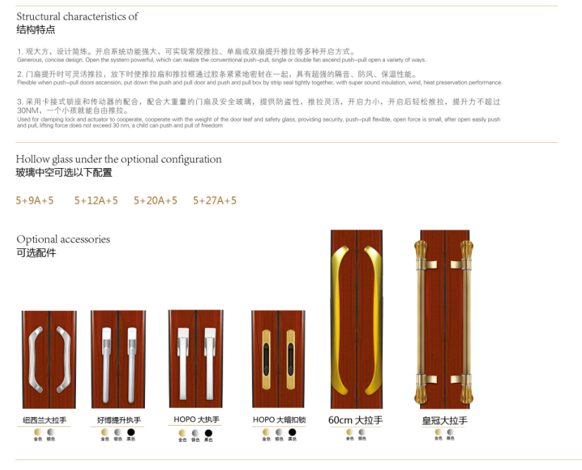 【產品系列】:塞納 【產品性能】:水密性能5級、隔音性能≥35DB、氣密性能6級、抗風壓性能8級、保溫性能K≤2.5 【產品結構】:采用6063-T5鋁材,防水軌隱藏排水結構,四道防撞膠條密封設計,5+20A+5中空玻璃 【五金配件】:標配好博窄邊暗鎖