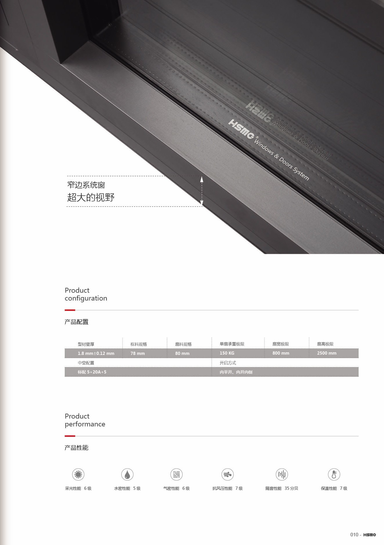 【產品系列】:塞納 【產品性能】:水密性能5級、隔音性能≥35DB、氣密性能6級、抗風壓性能8級、保溫性能K≤2.5 【產品結構】:采用6063-T5鋁材,防水軌隱藏排水結構,四道防撞膠條密封設計,5+20A+5中空玻璃 【五金配件】:標配好博窄邊暗鎖