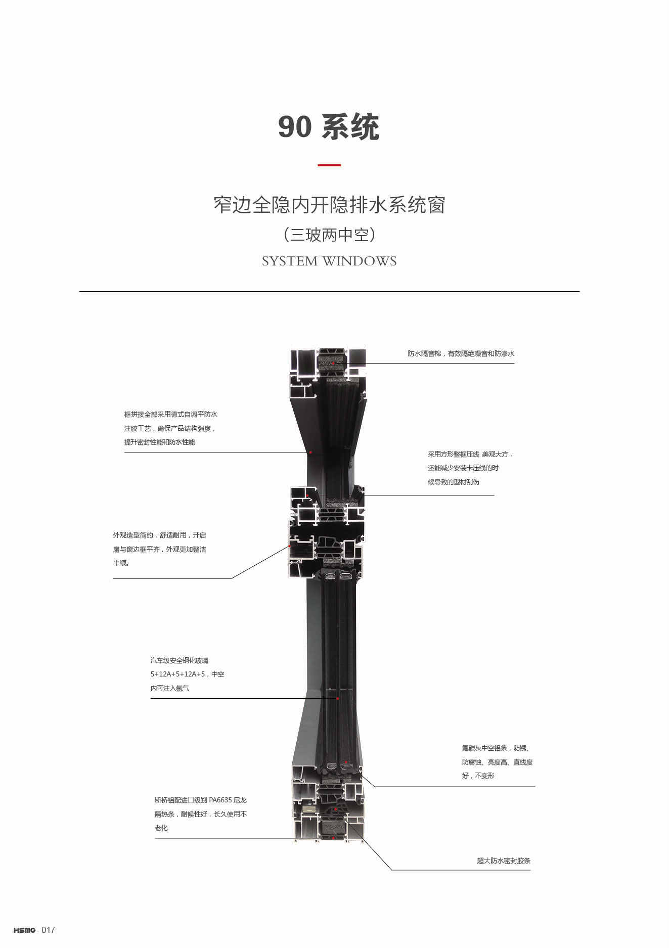 【產品系列】:塞納 【產品性能】:水密性能5級、隔音性能≥35DB、氣密性能6級、抗風壓性能8級、保溫性能K≤2.5 【產品結構】:采用6063-T5鋁材,防水軌隱藏排水結構,四道防撞膠條密封設計,5+20A+5中空玻璃 【五金配件】:標配好博窄邊暗鎖